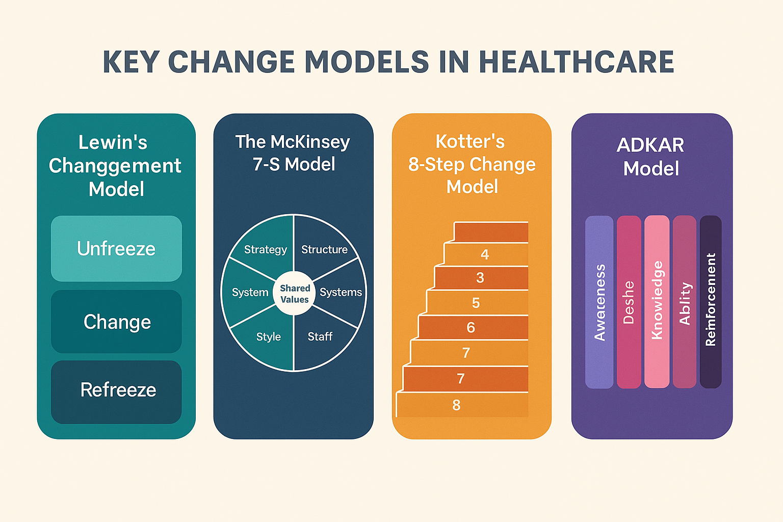 | Kotter change management model | The ADKAR change management model | McKinsey 7S framework |